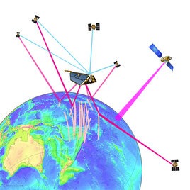 Spuren von Reflektionspunkten auf dem Indischen Ozean für ein Szenario mit einem Empfänger auf einem CHAMP-Orbit. Die Abbildung zeigt die Bodenspur des Empfängers (blau) sowie die Reflektionspunktverteilung für GPS (rot) kombiniert mit GLONASS (gelb) und GALILEO (orange). Die Reflektionspunkte, die am weitesten von der Empfängerspur entfernt liegen, haben die geringsten Einfallswinkel. |